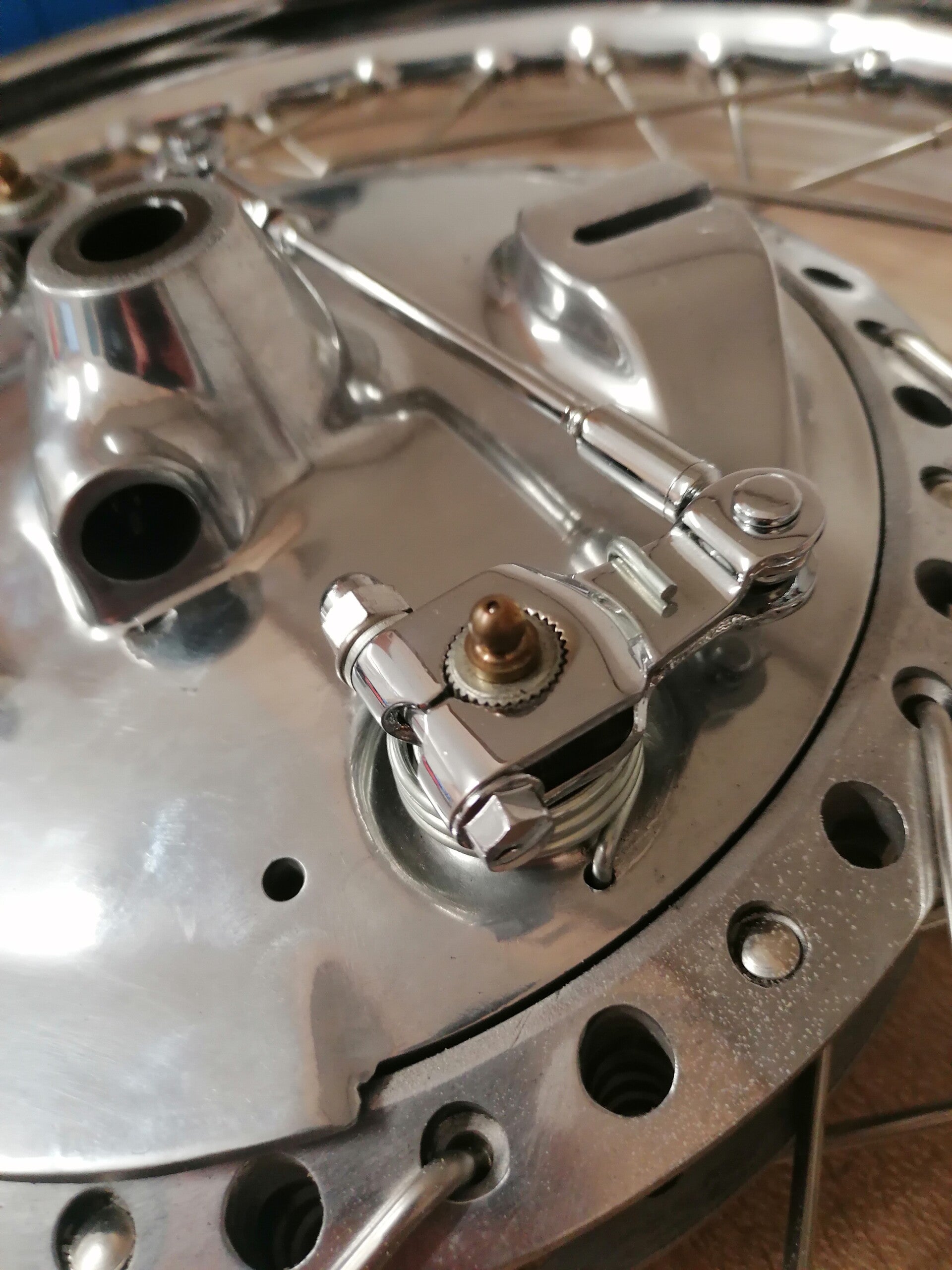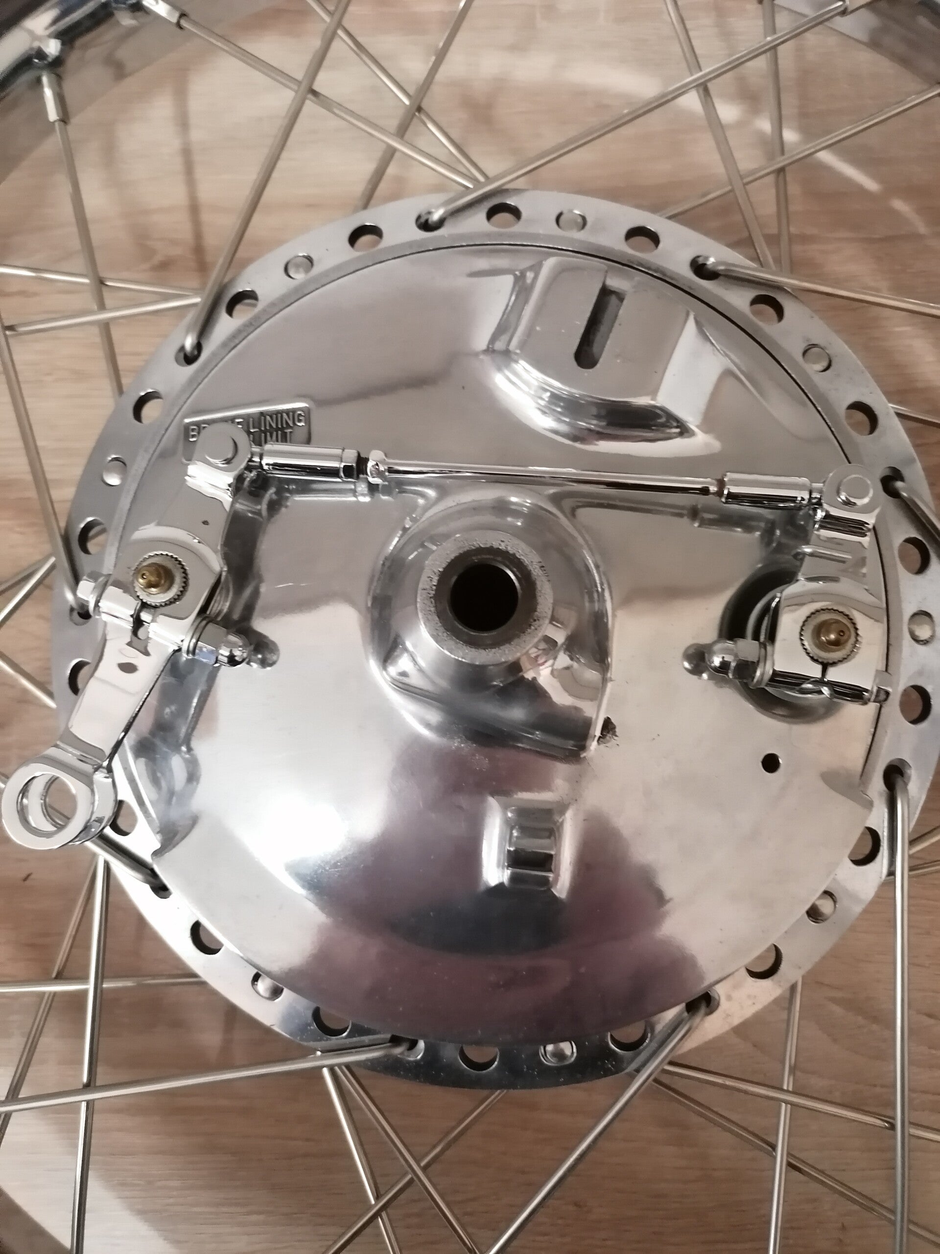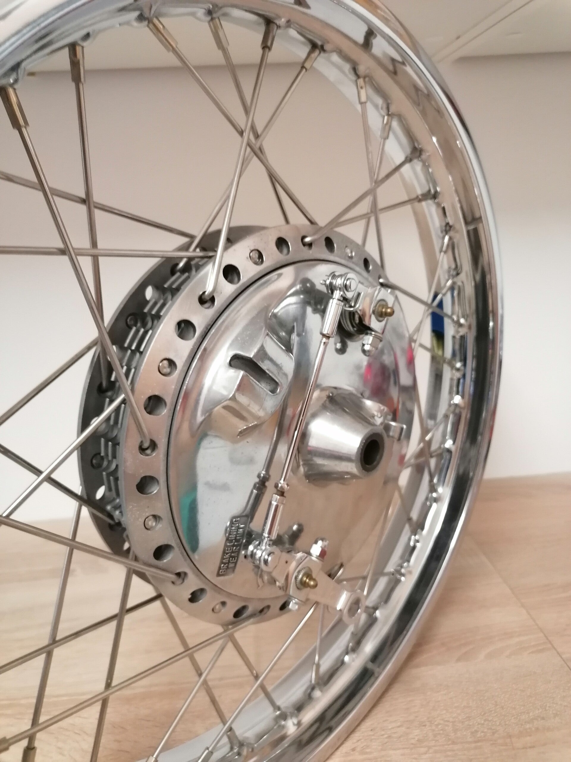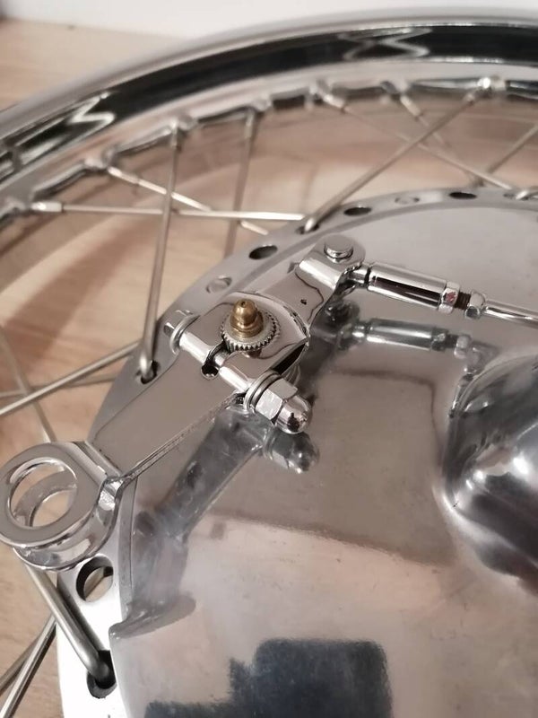 Das Vorderrad ist mit VA Speichen neu eingespeicht worden.Die Felge 1.85 x19 , Radlager und der Simmering auf der rechten Seite sind neu.Die Radnabe ist gebraucht und poliert. Die Bremsbeläge und die Schmiernippel sind neu. Die Bremshebel und die Druckstange sind neu verchromt worden.